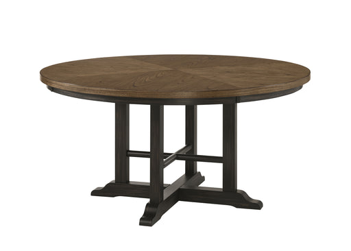Make a farmhouse-inspired statement with this dining table. Its clean two-tone finish, pedestal base and planked effect bring the charm of the coun...