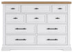 Casual style with substance. This two-tone dresser raises the bar on comfortably cozy design in your soothing sanctuary. A sturdy silhouette with a classic white finish and black metal hardware exudes modern farmhouse vibes. The butcher block oak veneer top adds a relaxed aesthetic. And this charmingly curated piece is spacious enough for all your essentials.